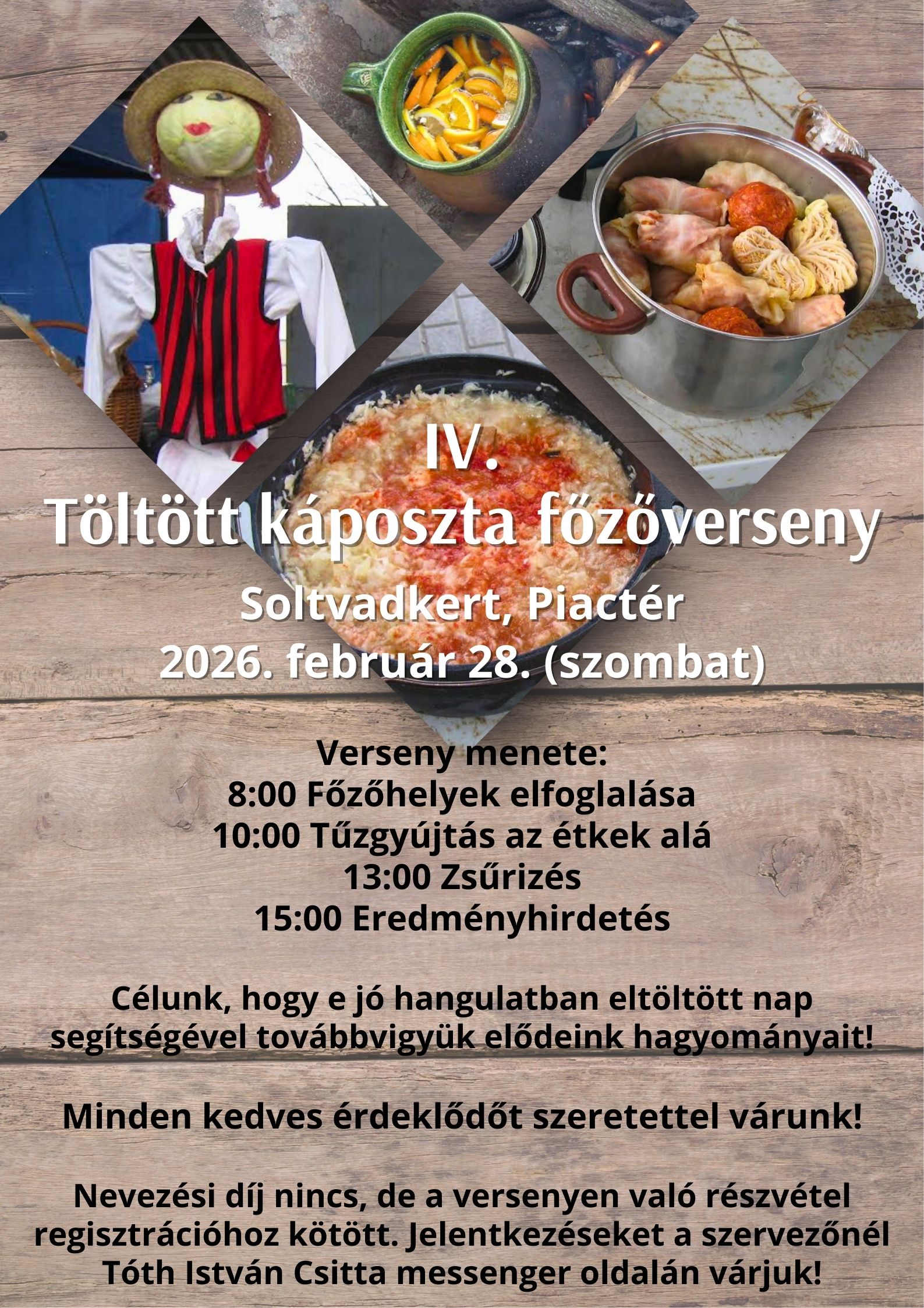 A soltvadkerti Töltött Káposzta Főző Versenyt 2026. február 28-án szombaton Tóth István „Csitta” flekkensütő mester szervezi. Honnan ez a tudománya? Sok éven át élt kint Kanadában, míg elsajátította ezt a barbecue-készítő szakmát. Utána hazatért és családot alapított. Aztán pedig gondolt egy nagyot és újra kiköltözött egy évre: feleségével, Zsuzsával munkát vállaltak, míg a két gyerek, Virág Veronika (11) és István (9) iskolába járt.