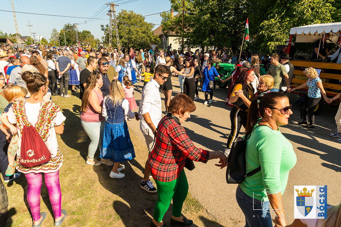 13.00: Start des Umzugs. Die zahlreichen Pferdewagen, Traktoren und andere Maschinen befahren den ganzen Ort. Unterwegs 2 Stationen, wo die Einwohner Köstlichkeiten, Getränke und Obst anbieten. Dort ist der Volkstanz „obligatorisch“. Man fährt auch auf die Flur namens Fischerbócsa.