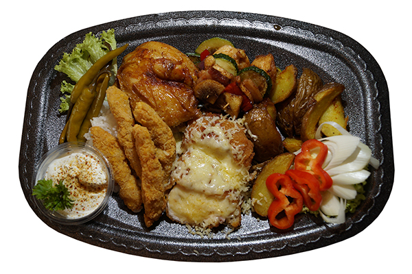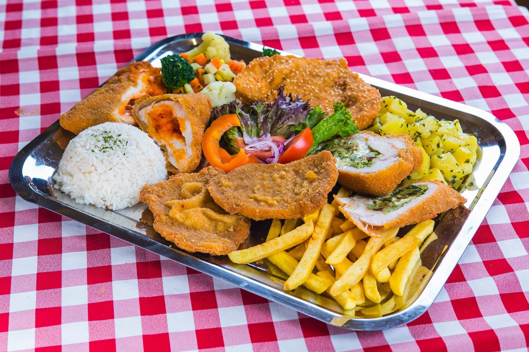 Cigánypecsenye sült szalonnával, csirkemell ropogós panko morzsában, Sajttal-sonkával töltött rántott szelet, rántott hagymakarikák, Rántott gomba, Rántott sajt