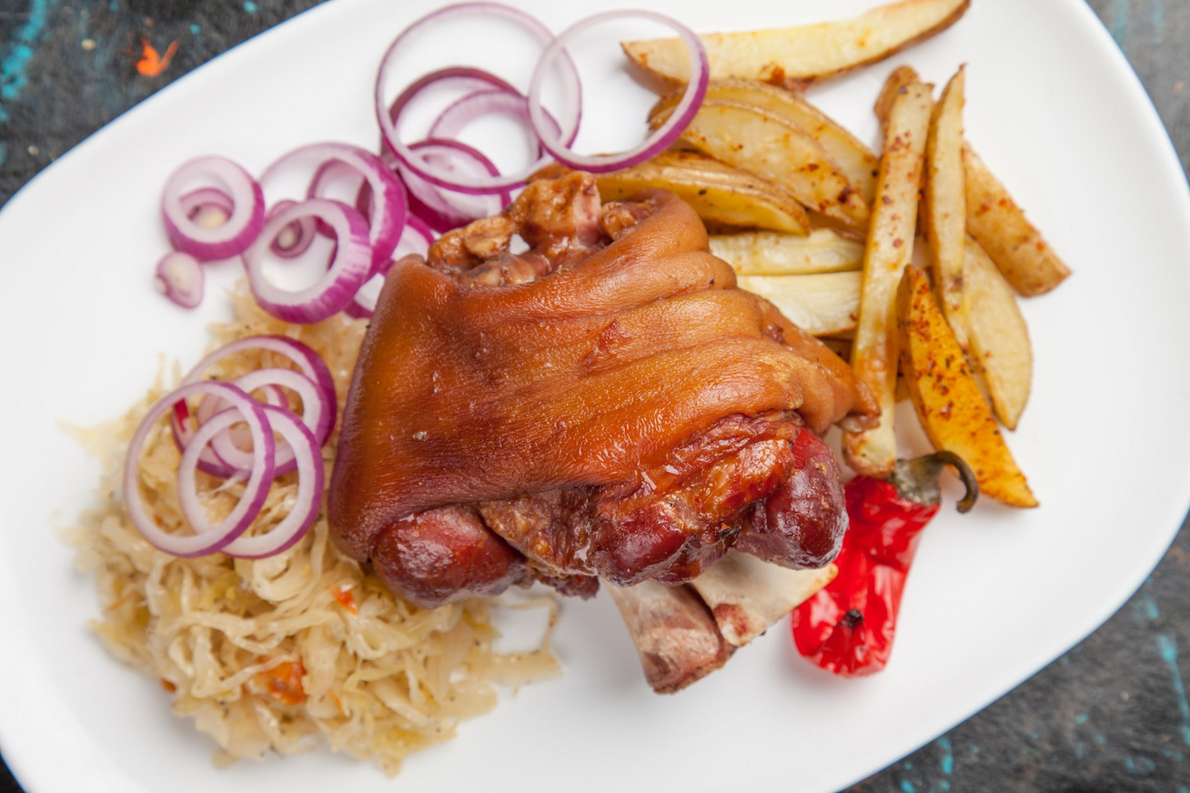 Zigeunerbraten mit Knoblauch, gebratenem Speck, hausgemachter Grillwurst, sauerem, gedünstetem Kohl, im Ofen gebackenem Schweinshaxe, mit Käse und Schinken gefüllte Schnitzel, Hähnchenbrust in knuspriger Panade, Käse-Schnitzel, Pilz-Schnitzel, Zwiebel-Schnitzel