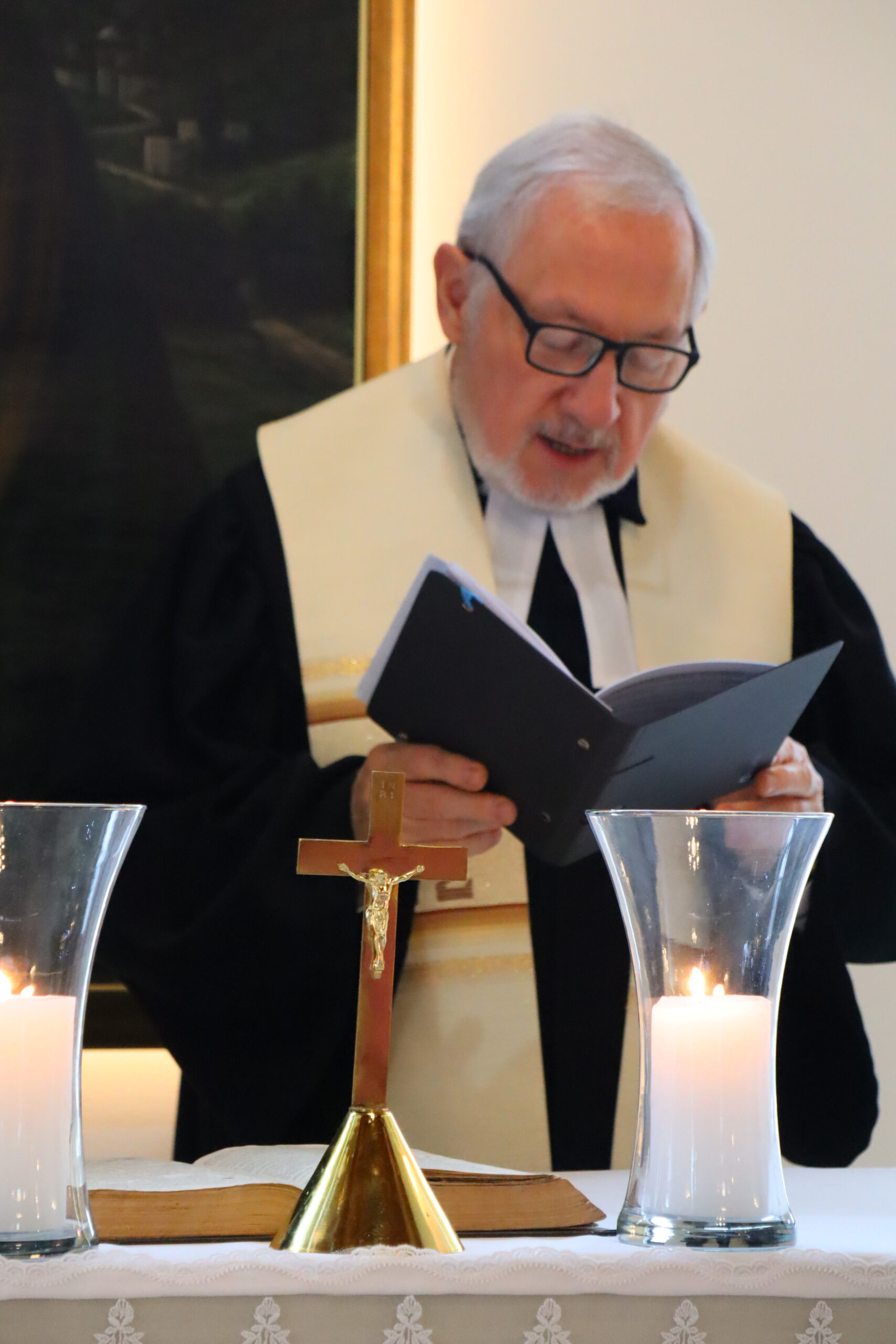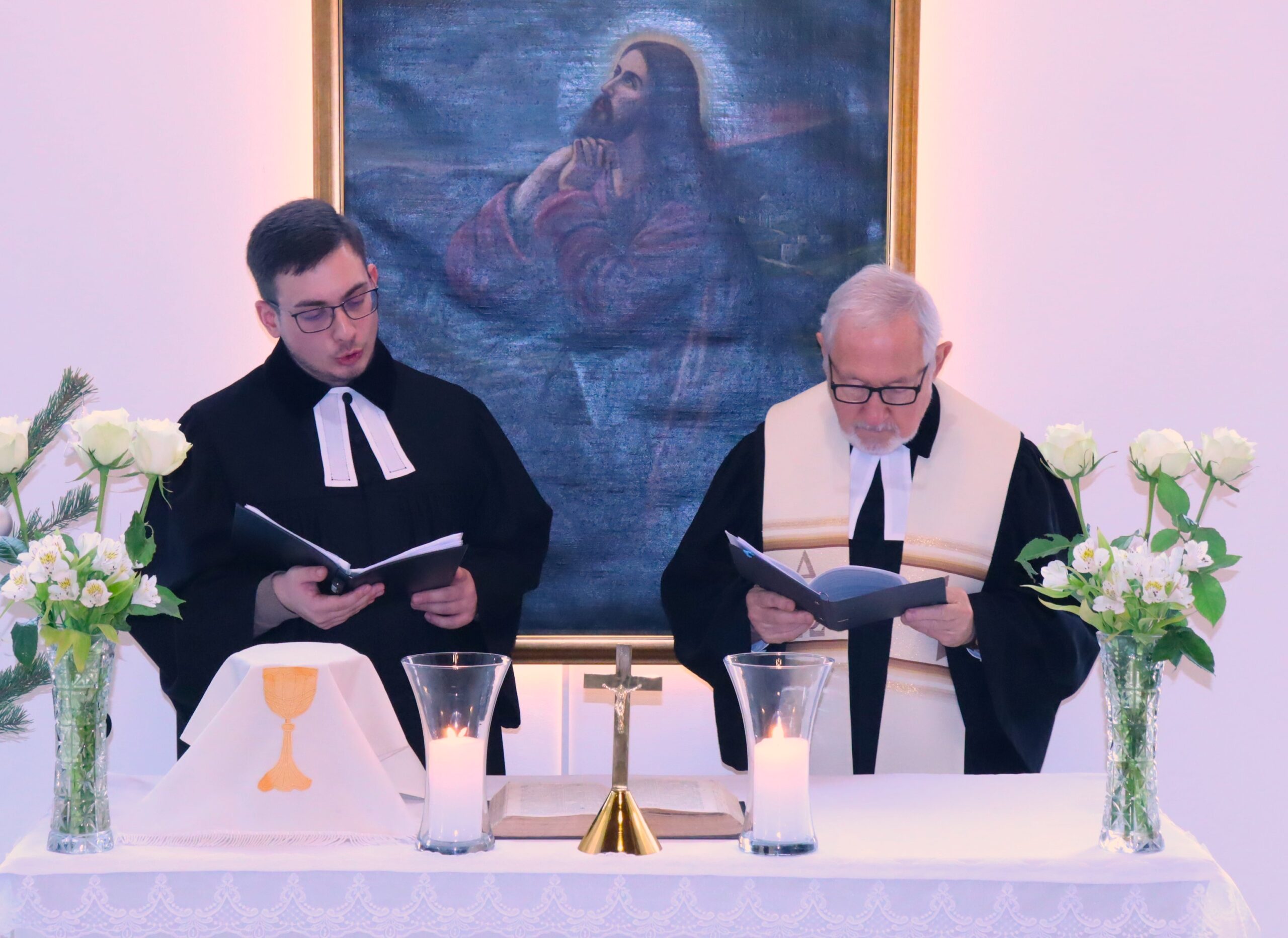 hat Pfarrer Dr. Hafenscher erörtert. Man schafft in der Stube eine feierliche Atmosphäre mit Kerzen, Plätzchen, Tannenduft… Aber die Botschaft des Festes ist: „Wir sind bei Gott! Das heißt, nicht durch unsere Werke, sondern durch Gottes Gnade!“ Nach dem Gottesdienst blieben alle beisammen und tauschten ihre Gedanken bei einem kleinen Imbiss aus.