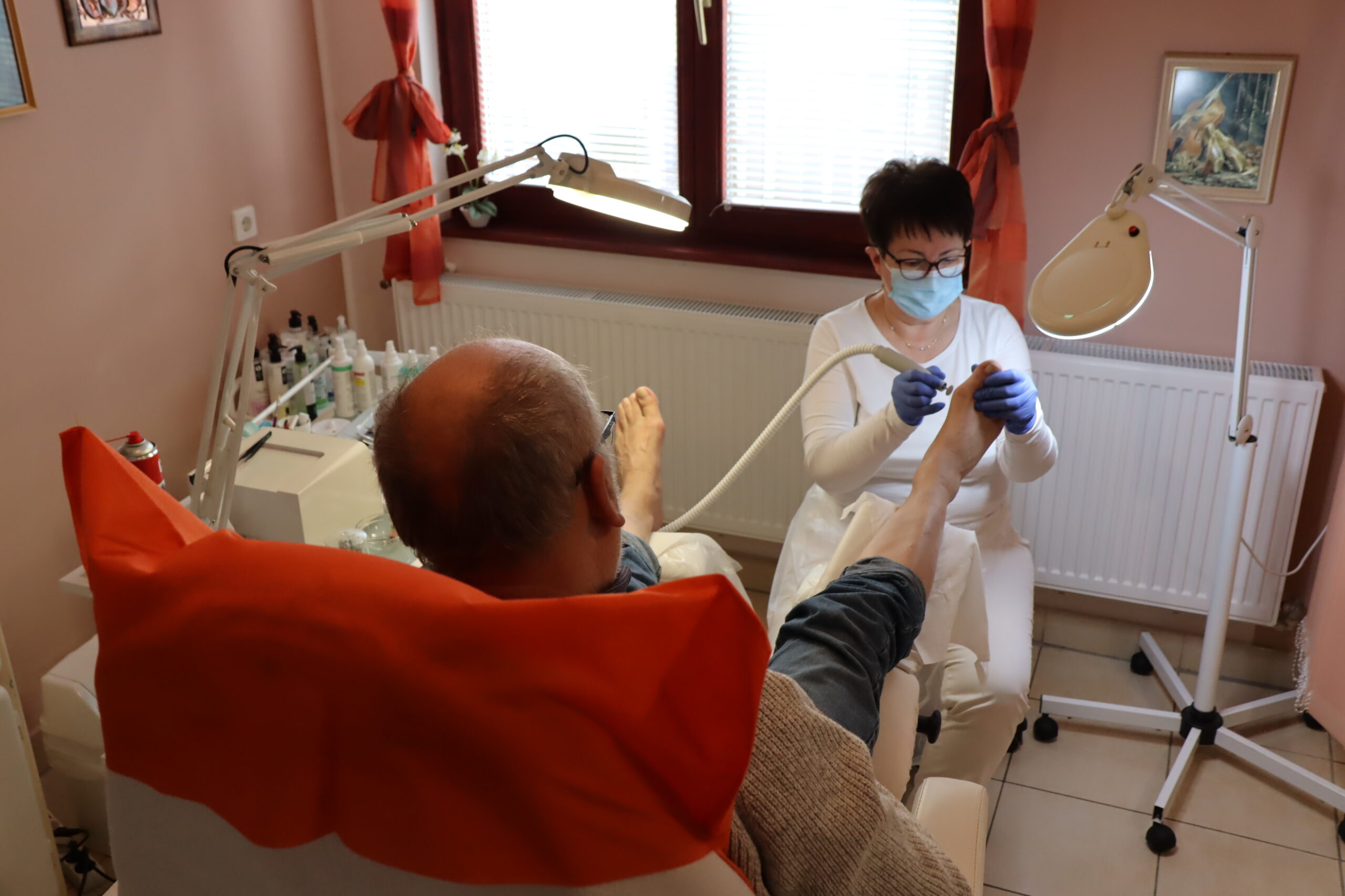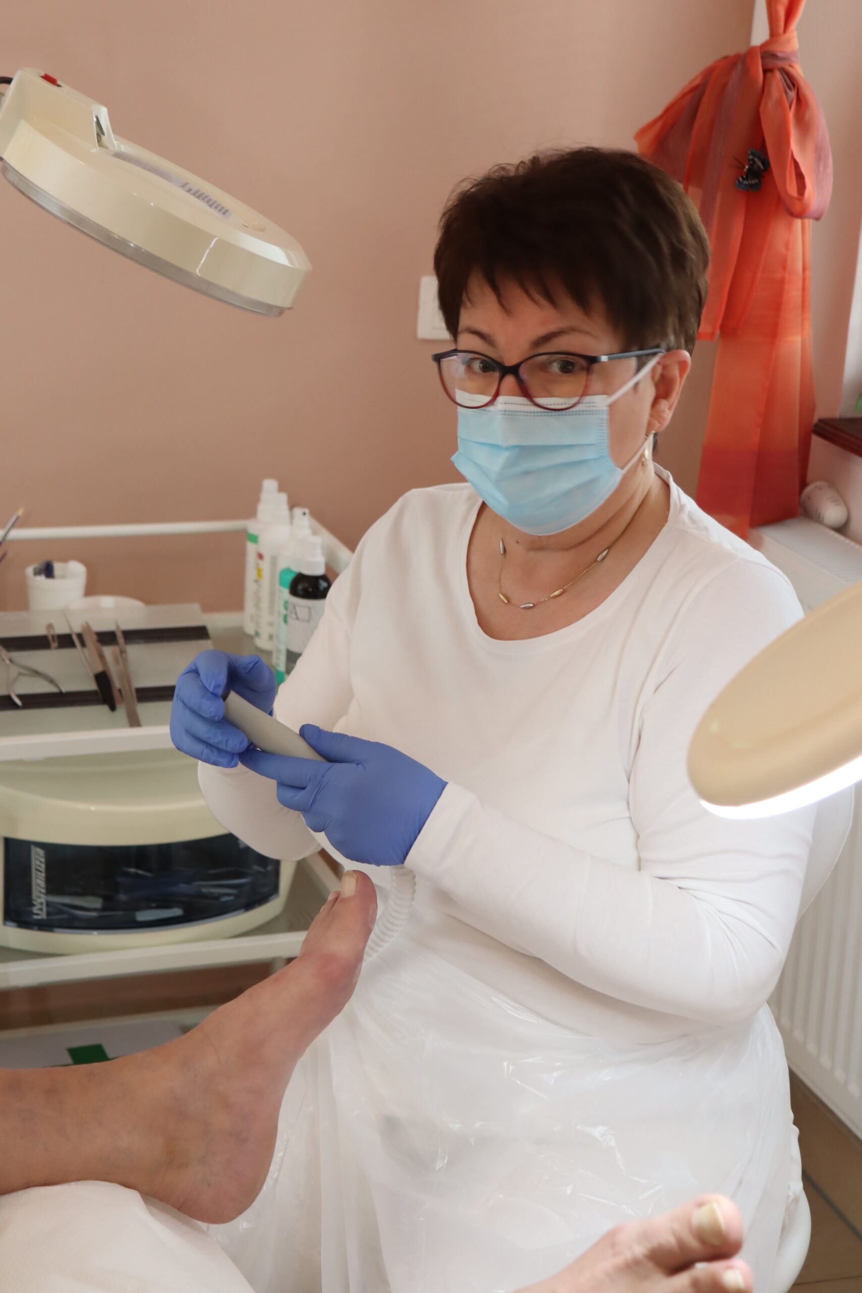Ich überprüfe den Zustand der Füße des Kunden. Es werden Fragen gestellt, ich stelle die Hautqualität fest. So werden die eingesetzten Mittel, Geräte und Technologie ausgewählt.  Die Behandlung wird auf diese Weise individualisiert. Nach der Fußpflege folgen eine angenehme Fußgymnastik und zum Abschluss eine Fußmassage.
